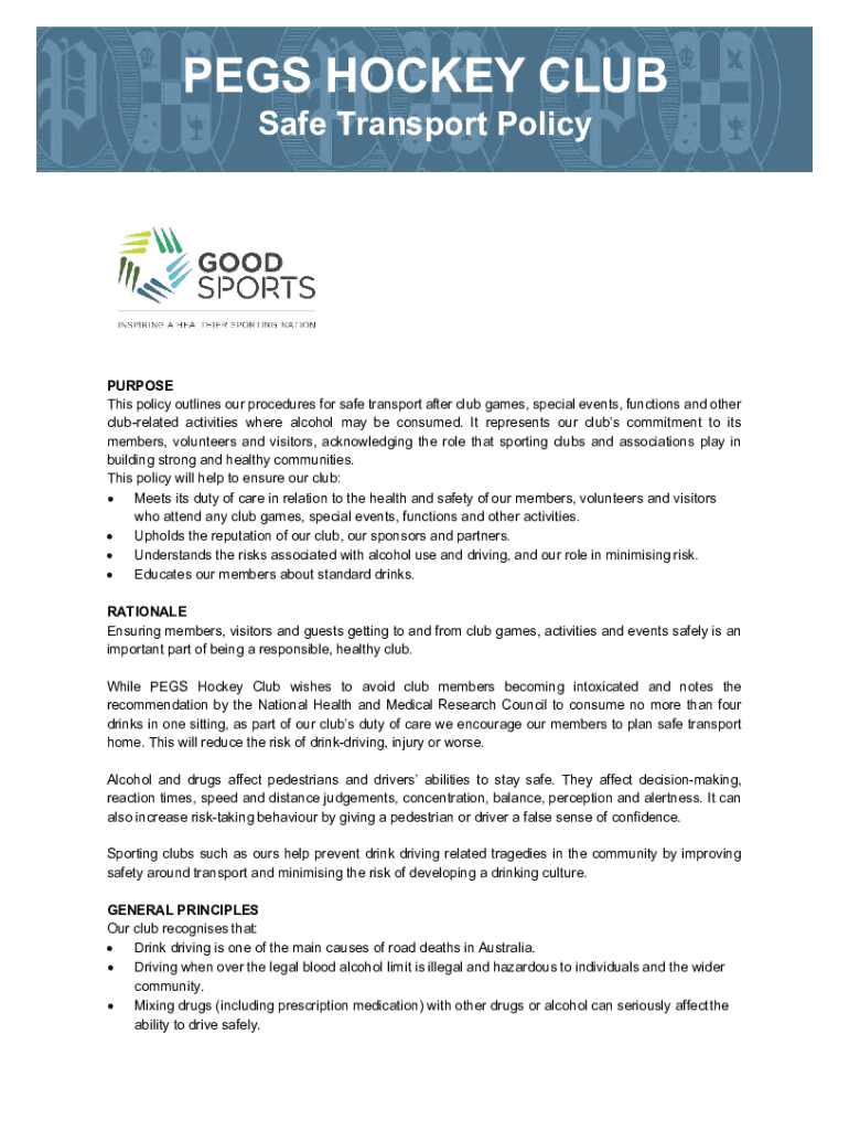 PEGS HOCKEY CLUB Safe Transport PolicyPURPOSE This policy outlines our procedures for safe transport after club games, special events, functions and other club related activities where alcohol may