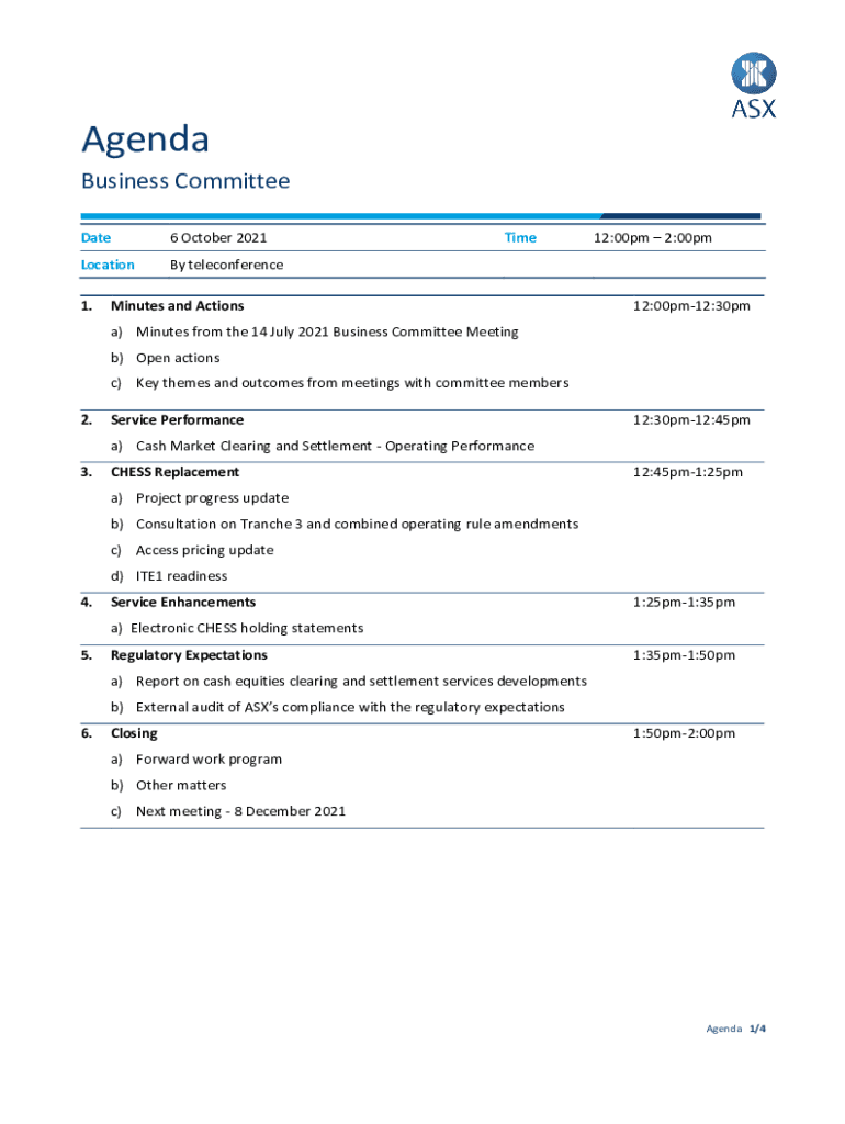 Agenda Business Committee Date6 October 2021LocationBy teleconference1. Timelines and Actions12:00pm 2:00pm12:00pm12:30pma) Minutes from the 14 July 2021 Business Committee Meeting b) Open actions
