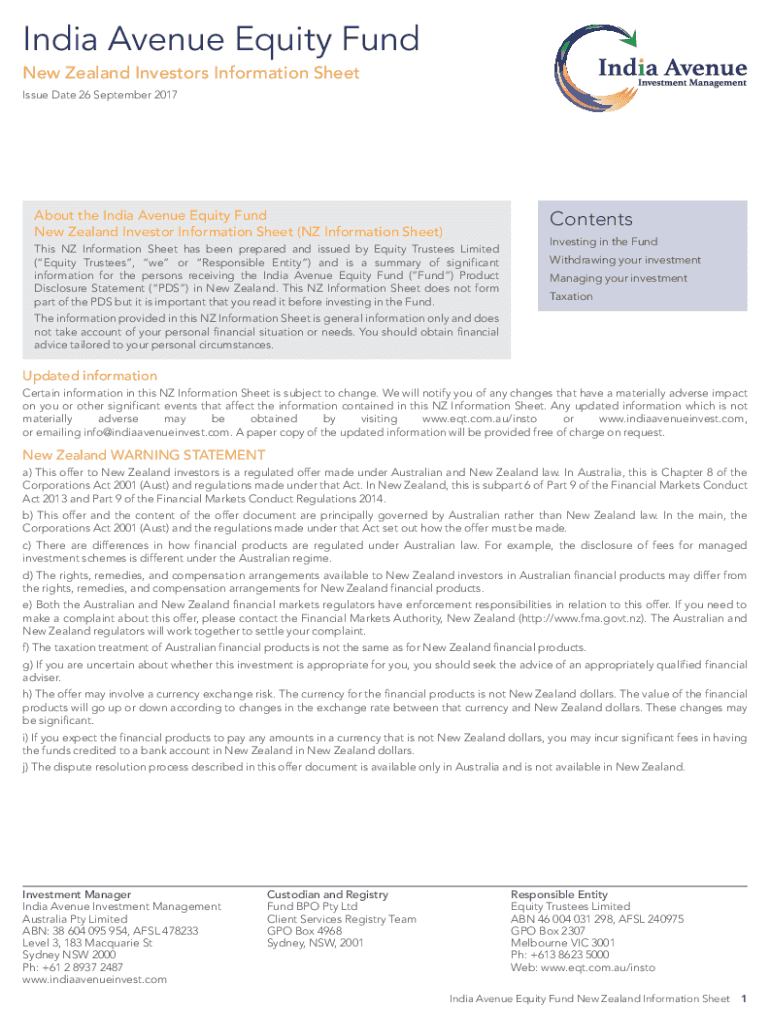 India Avenue Equity Fund New Zealand Investors Information Sheet Issue Date 26 September 2017About the India Avenue Equity Fund New Zealand Investor Information Sheet (NZ Information Sheet)ContentsThis