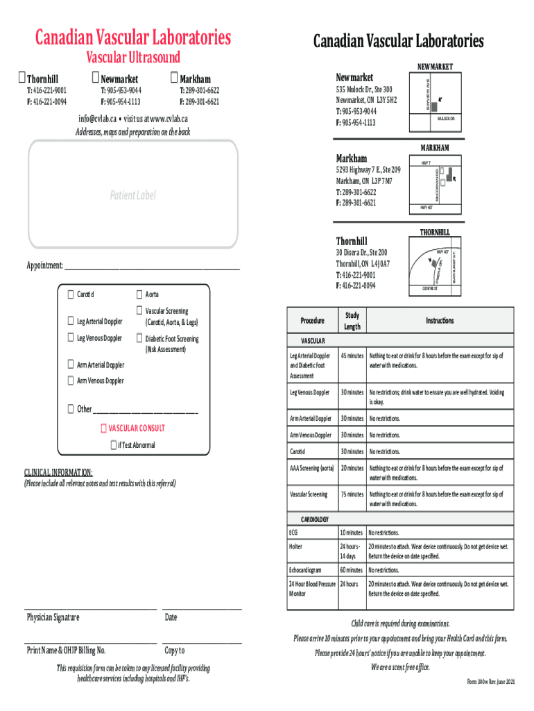 Canadian Vascular Laboratories Canadian Vascular Laboratories 535 Mulock Dr., Ste 300 Newmarket, ON L3Y 5H2 T: 9059539044 F: 9059541113T: 2893016622 F: 2893016621info@cvlab.ca visit us at www.cvlab.ca