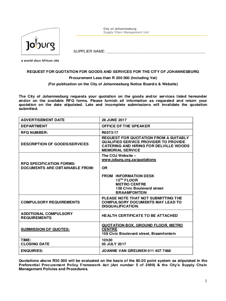City of Johannesburg Supply Chain Management UnitSUPPLIER NAME: ___REQUEST FOR QUOTATION FOR GOODS AND SERVICES FOR THE CITY OF JOHANNESBURG Procurement Less than R 200 000 (Including Vat) (For publication