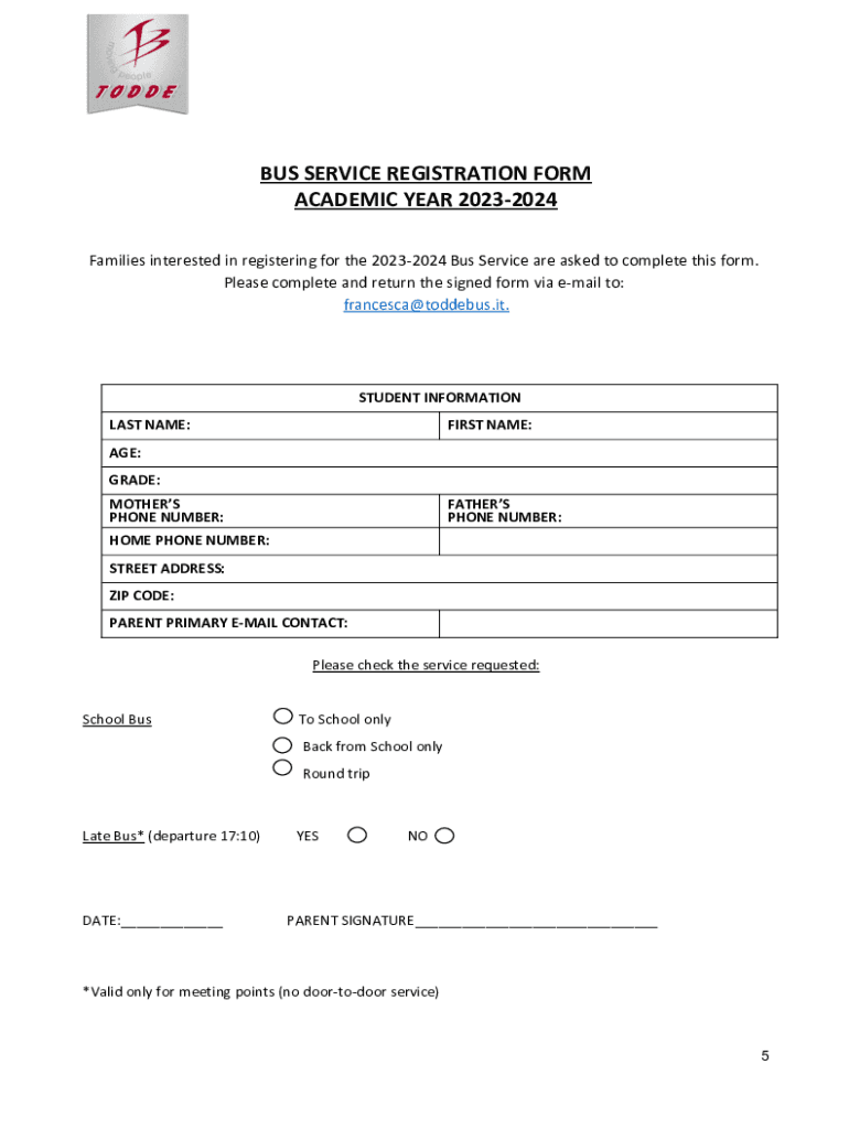BUS SERVICE REGISTRATION FORM ACADEMIC YEAR 20232024 Families interested in registering for the 20232024 Bus Service are asked to complete this form. Please complete and return the signed form via
