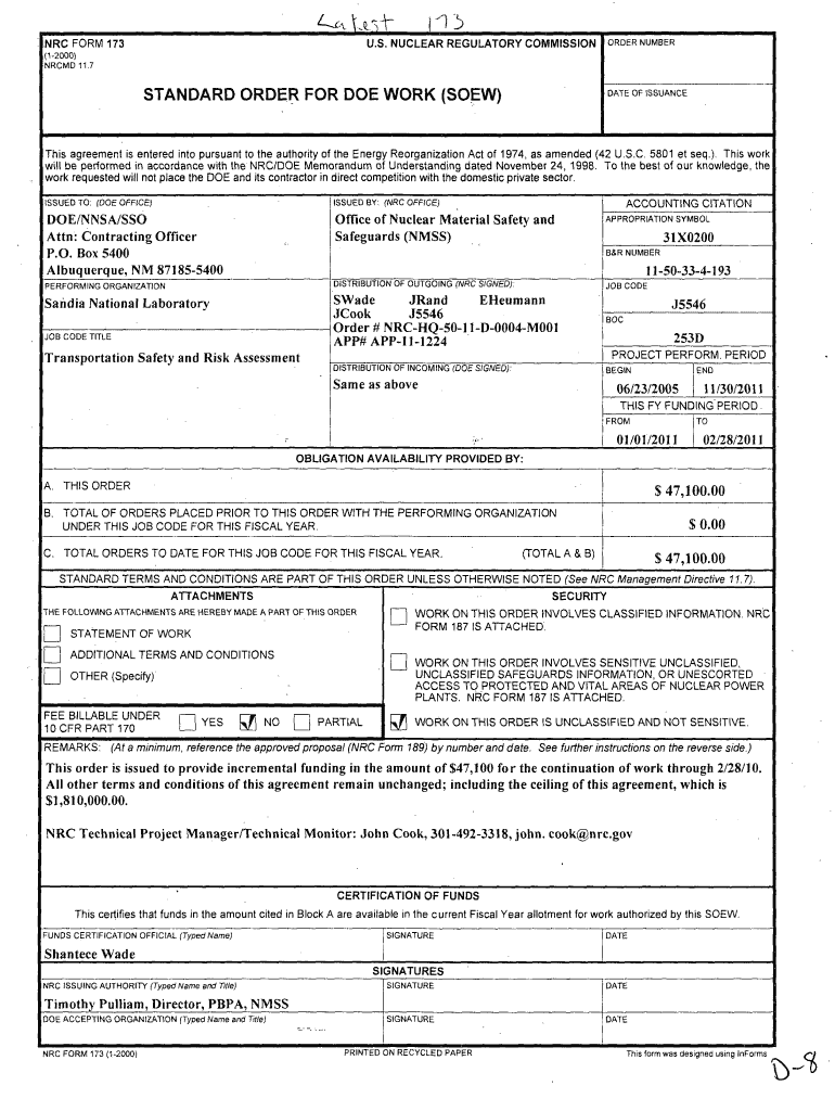Get the free NRC Form 173 Standard Order for DOE Work (SOEW ... - pbadupws nrc