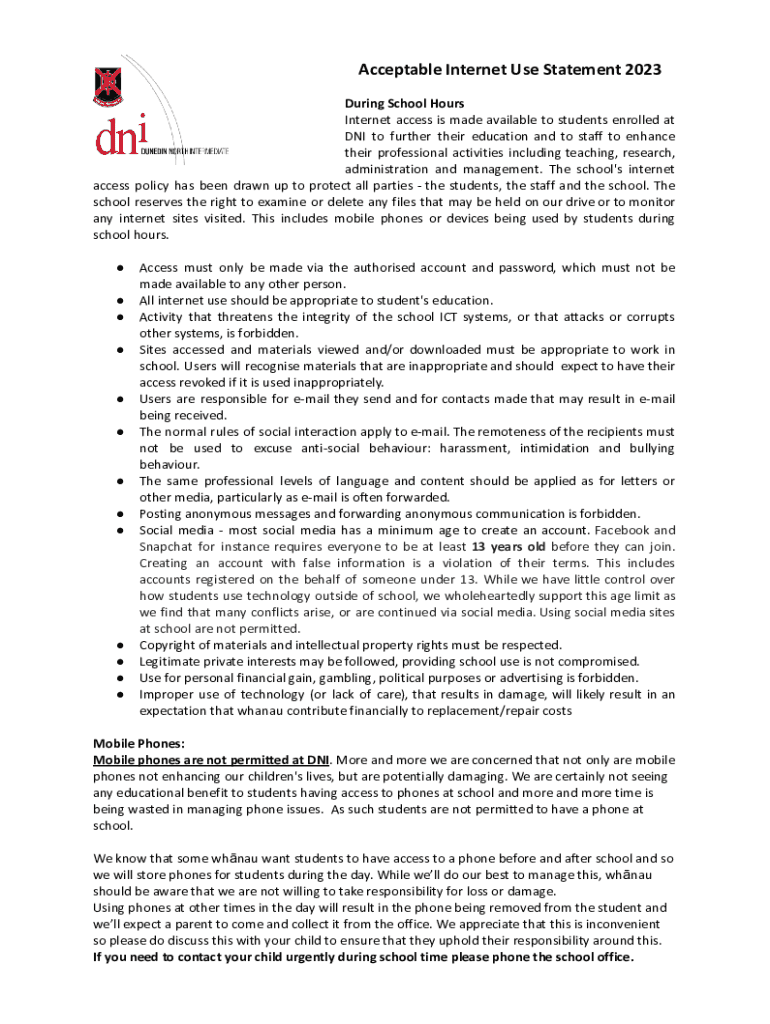 Acceptable Internet Use Statement 2023 During School Hours Internet access is made available to students enrolled at DNI to further their education and to staff to enhance their professional activities