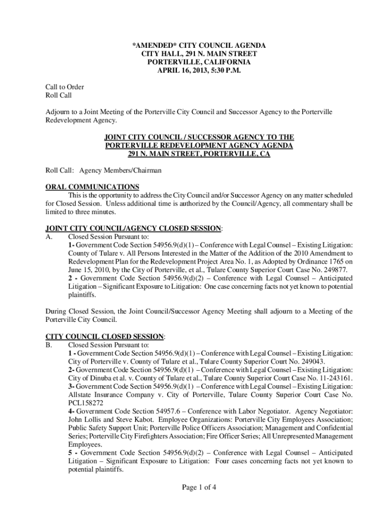 *AMENDED* CITY COUNCIL AGENDA CITY HALL, 291 N. MAIN STREET PORTERVILLE, CALIFORNIA APRIL 16, 2013, 5:30 P.M. Call to Order Roll Call Adjourns to a Joint Meeting of the Porterville City Council and