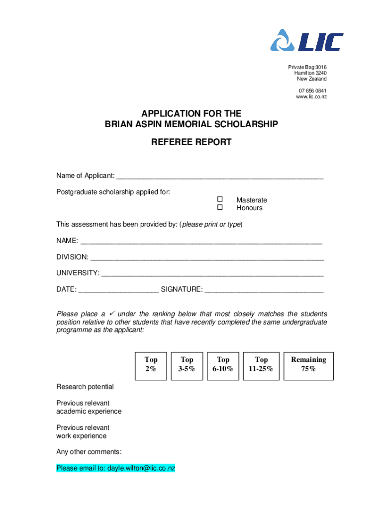 Private Bag 3016 Hamilton 3240 New Zealand 07 856 0841 www.lic.co.nzAPPLICATION FOR THE BRIANA SPIN MEMORIAL SCHOLARSHIP REFEREE Reportage of Applicant: ___ Postgraduate scholarship applied for: Master