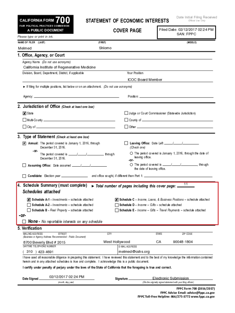 CALIFORNIA FORM700DateInitialFilingReceivedStAtement Of economic intereStSOfficial Use OnlyFans POLITICAL Practices Commissioner Page Public Documented Date: 02/12/2017 02:24 PM