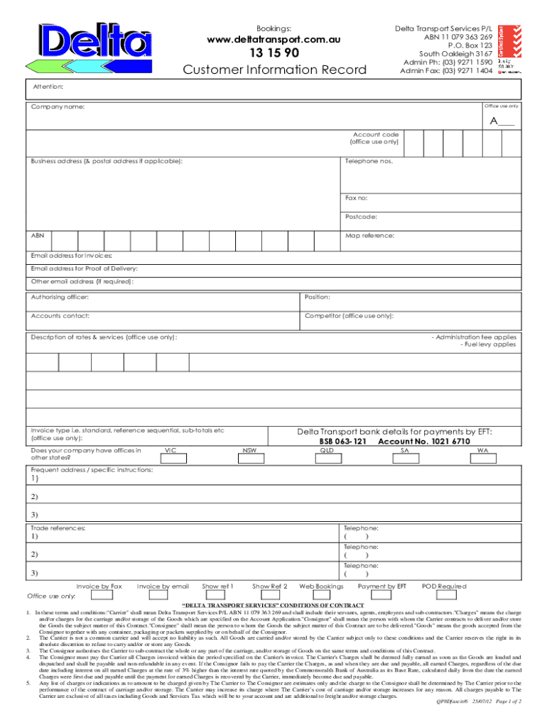 Bookings:www.deltatransport.com.au13 15 90 Customer Information Record Delta Transport Services P/L ABN 11 079 363 269 P.O. Box 123 South Oakland 3167 Admin pH: (03) 9271 1590 Admin Fax: (03) 9271