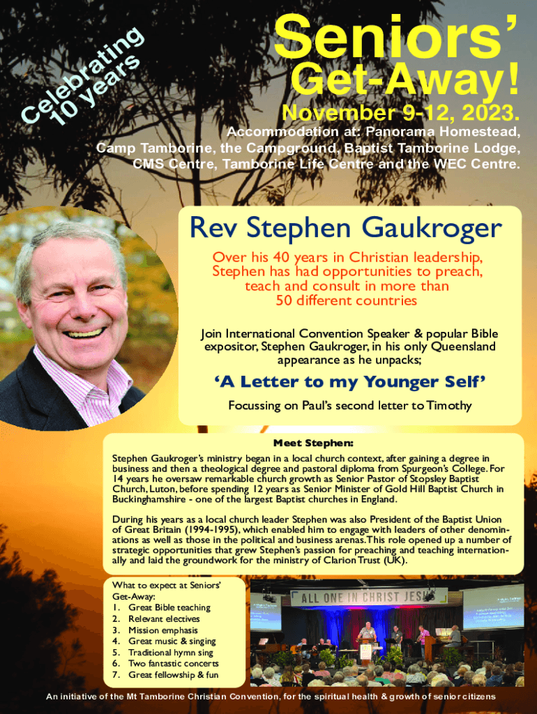 Seniors n i s t an r r a b e e y l e 0 C 1GetAway! November 912, 2023. Accommodation at: Panorama Homestead, Camp Tambourine, the Campground, Baptist Tambourine Lodge, CMS Center, Tambourine Life
