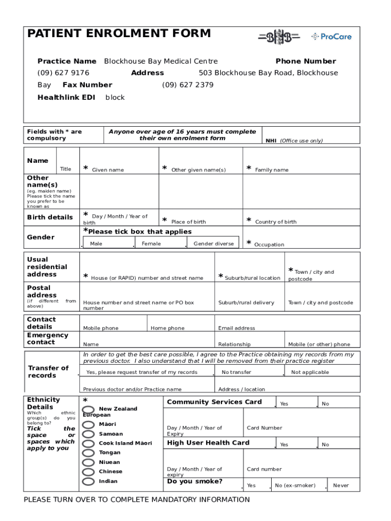 Patients must report their personal information, medical history, and details of the services received on Blockhouse Bay Medical Centre forms.