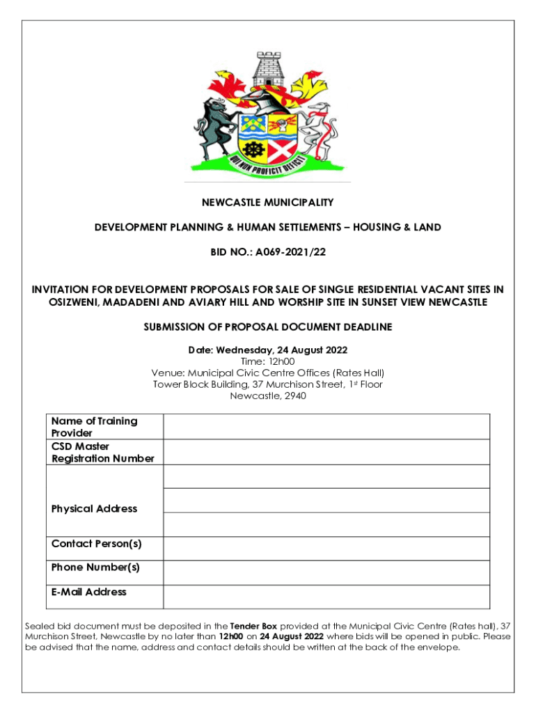 NEWCASTLE MUNICIPALITY DEVELOPMENT PLANNING & HUMAN SETTLEMENTS HOUSING & LAND BID NO.: A0692021/22 INVITATION FOR DEVELOPMENT PROPOSALS FOR SALE OF SINGLE RESIDENTIAL VACANT SITES IN OSIZWENI, MADDEN