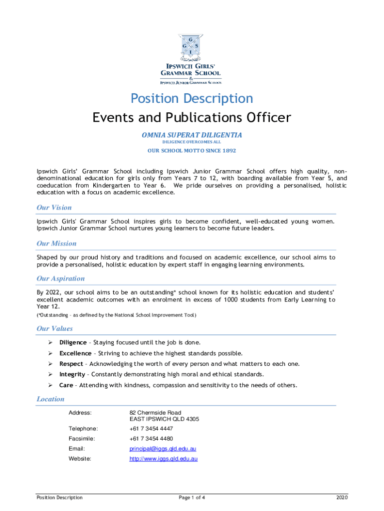 Position Description Events and Publications Officer OM NIA SUPER AT DILIGENT IA DILIGENCE OVERCOMES ALLOW SCHOOL MOTTO SINCE 1892Ipswich Girls Grammar School including Ipswich Junior Grammar School