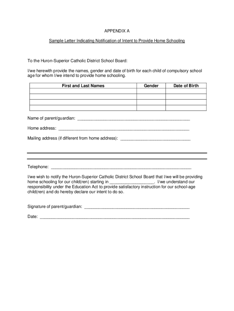 Sample Letter Indicating Notification of Intent to Provide Homeschooling the Huron Superior Catholic District School Board: