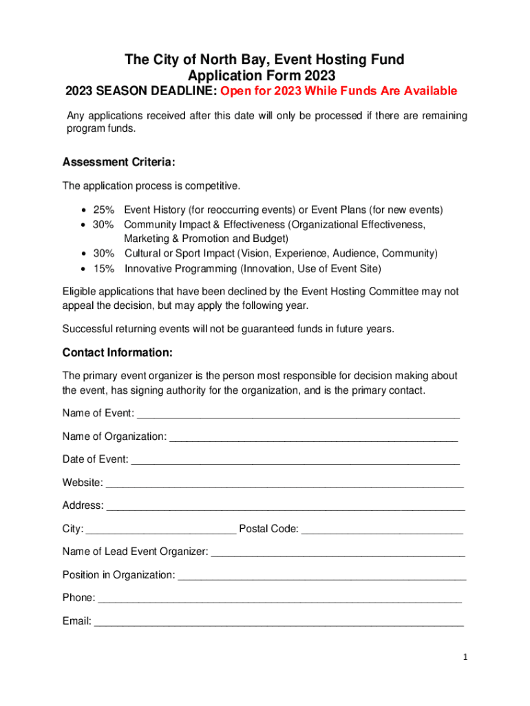 The City of North Bay, Event Hosting Fund Application Form 20232023 SEASON DEADLINE: Open for 2023 While Funds Are Available Any applications received after this date will only be processed if there