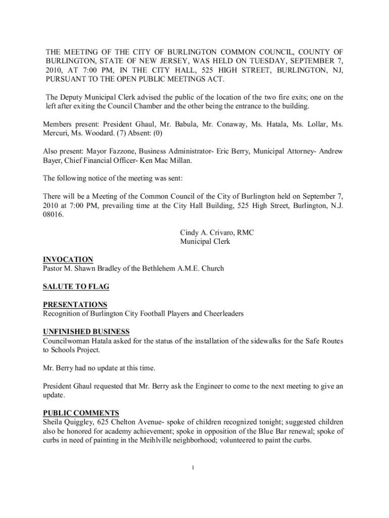 THE MEETING OF THE CITY OF BURLINGTON COMMON COUNCIL, COUNTY OF BURLINGTON, STATE OF NEW JERSEY, WAS HELD ON TUESDAY, SEPTEMBER 7, 2010, AT 7:00 PM, IN THE CITY HALL, 525 HIGH STREET, BURLINGTON,