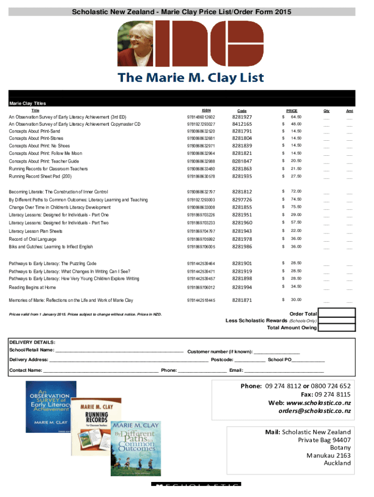 Scholastic New Zealand Marie Clay Price List/Order Form 2015Marie Clay Titles TitleISBNQtyAmt$64.50______$48.00______$14.50______$14.50______$14.50______97808686329648281927 8412165 8281791 8281804