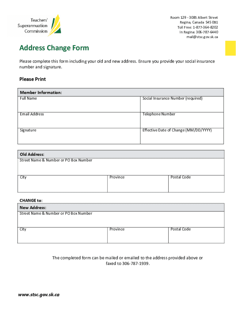Room 129 3085 Albert Street Regina, Canada S4S 0B1 Toll Free: 18773648202 In Regina: 3067876440 mail@stsc.gov.sk.caAddress Change Form Please complete this form including your old and new address.