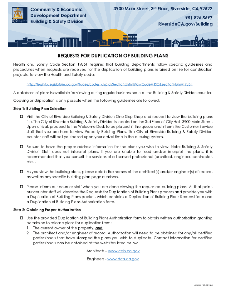 Community & Economic Development Department Building & Safety Division3900 Main Street, 3rd Floor, Riverside, CA 92522 951.826.5697 RiversideCA.gov/BuildingREQUESTS FOR DUPLICATION OF BUILDING PLANS