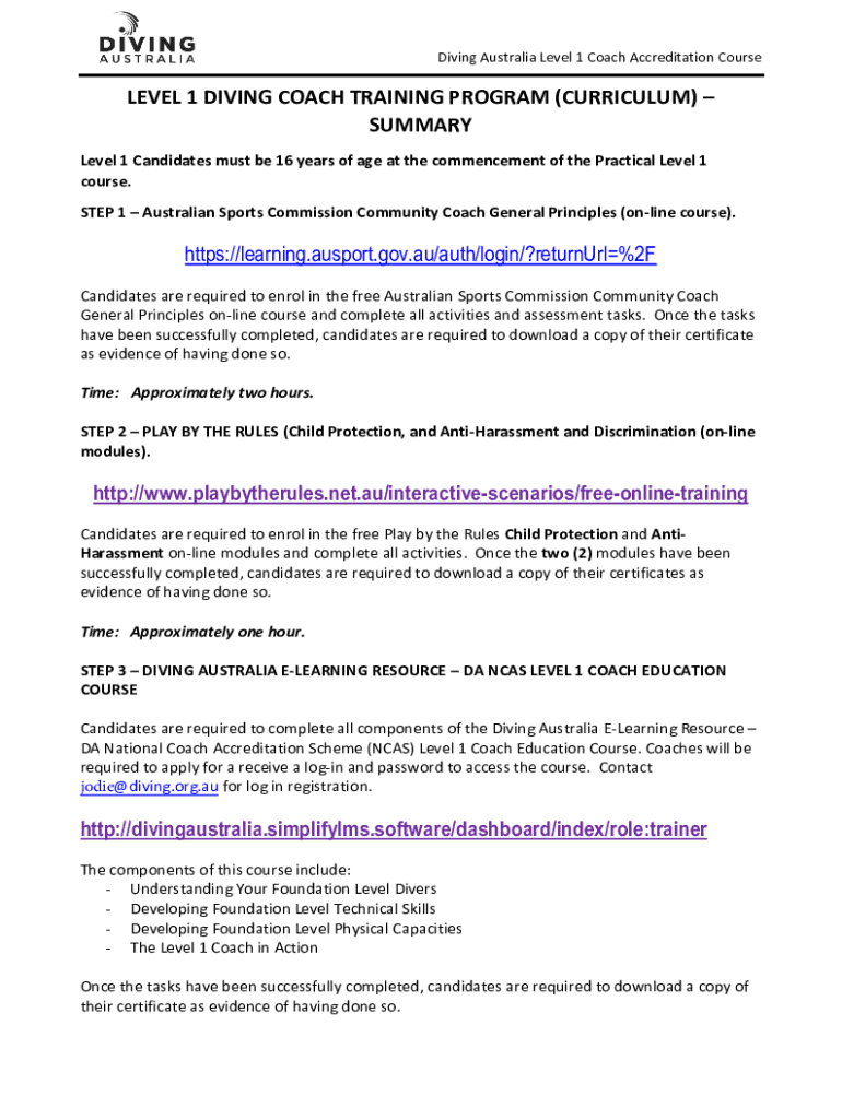 Diving Australia Level 1 Coach Accreditation Ourselves 1 DIVING COACH TRAINING PROGRAM (CURRICULUM) SUMMARY Level 1 Candidates must be 16 years of age at the commencement of the Practical Level 1