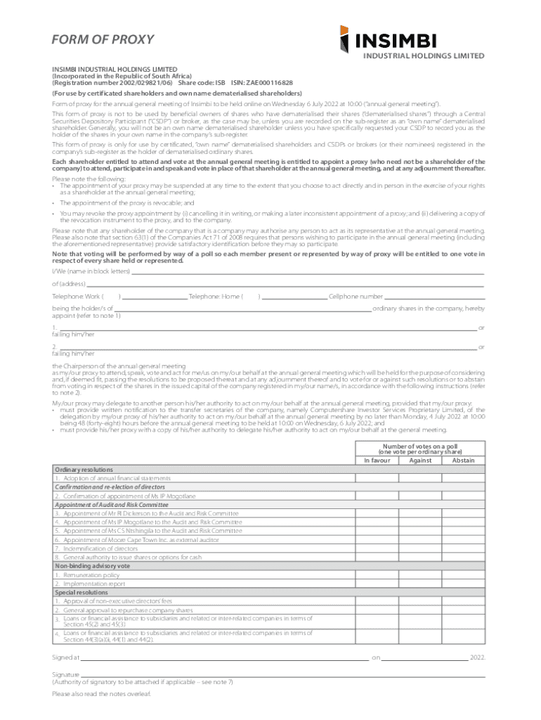 FORM OF PROXY INDUSTRIAL HOLDINGS LIMITED NIMBI INDUSTRIAL HOLDINGS LIMITED (Incorporated in the Republic of South Africa) (Registration number 2002/029821/06) Share code: ISB ISIN: ZAE000116828 (For