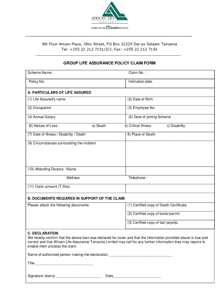 ___ 9th Floor Mani Place, Ohio Street, PO Box 22229 Dar es Salaam Tanzania Tel: +255 22 212 7151/2/3, Fax: +255 22 212 7154 ___GROUP LIFE ASSURANCE POLICY CLAIM FORM Scheme Name:Claim No. Policy No.