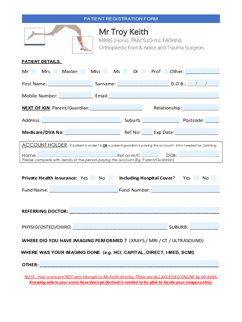 PATIENT REGISTRATION FORMATION DETAILSPATIENT DETAILSMrMrsMasterMissMsDrProfOther: ___First Name: ___ Surname: ___ D.O.B.: ___/___/___