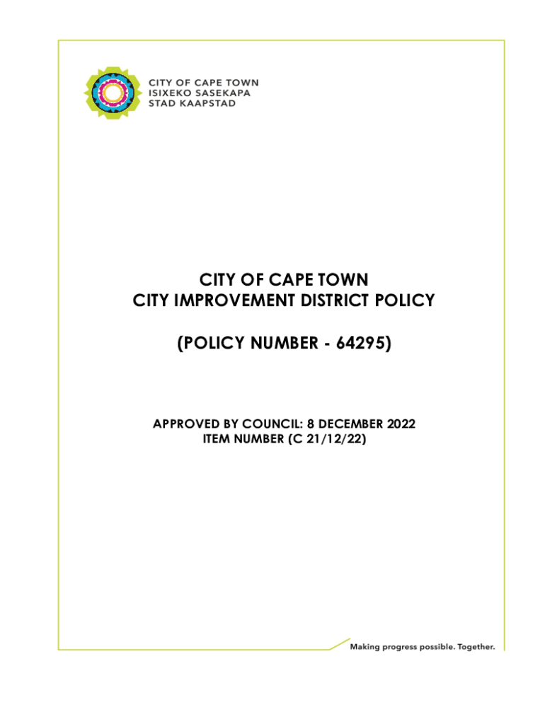 CITY OF CAPE TOWN CITY IMPROVEMENT DISTRICT POLICY (POLICY NUMBER 64295)APPROVED BY COUNCIL: 8 DECEMBER 2022 ITEM NUMBER (C 21/12/22)2CITY OF CAPE TOWN CITY IMPROVEMENT DISTRICT POLICYINDEXChapter