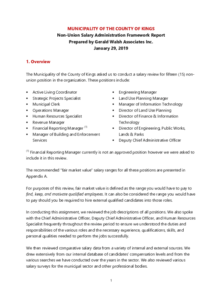MUNICIPALITY OF THE COUNTY OF KINGS Nonunion Salary Administration Framework Report Prepared by Gerald Walsh Associates Inc. January 29, 2019 1. Overview The Municipality of the County of Kings asked