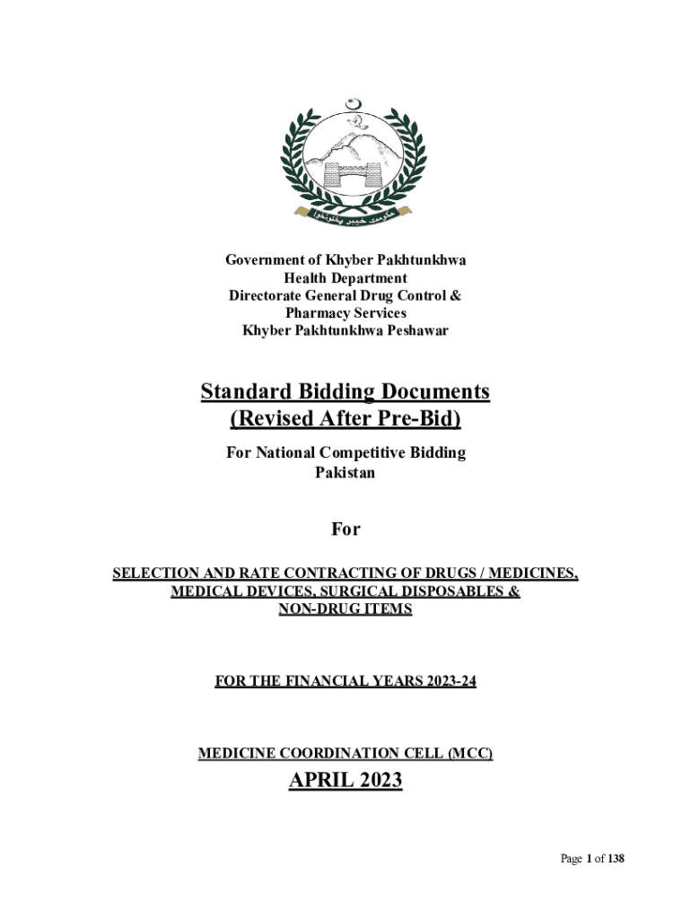 Government of Khyber Pakhtunkhwa Health Department Directorate General Drug Control & Pharmacy Services Khyber Pakhtunkhwa PeshawarStandard Bidding Documents (Revised After PreBid) For National Competitive