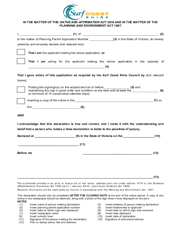 IN THE MATTER OF THE OATHS AND AFFIRMATION ACT 2018 AND IN THE MATTER OF THE PLANNING AND ENVIRONMENT ACT 1987; I, ___ (1) of ___ (2) to the matter of Planning Permit Application Number ___(3) in