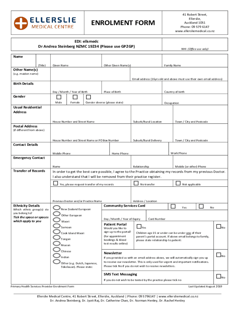 41 Robert Street, Leslie, Auckland 1051 Phone: 09 579 6147 www.ellersliemedical.co.nzENROLMENT FORM EDI: Ellesmere Dr Andrea Steinberg NAMC 19234 (Please use GP2GP)NHS (Office use only)Name (Title)Given