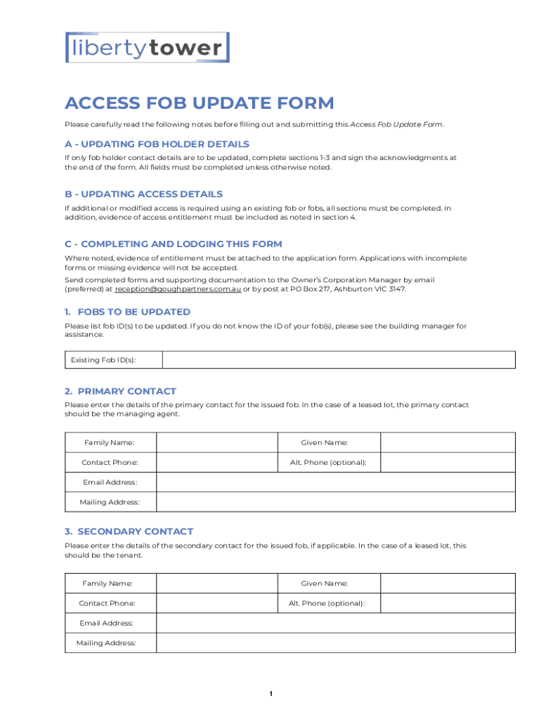 ACCESS FOB UPDATE FORM Please carefully read the following notes before filling out and submitting this Access Fob Update Form. A UPDATING FOB HOLDER DETAILS If only fob holder contact details are