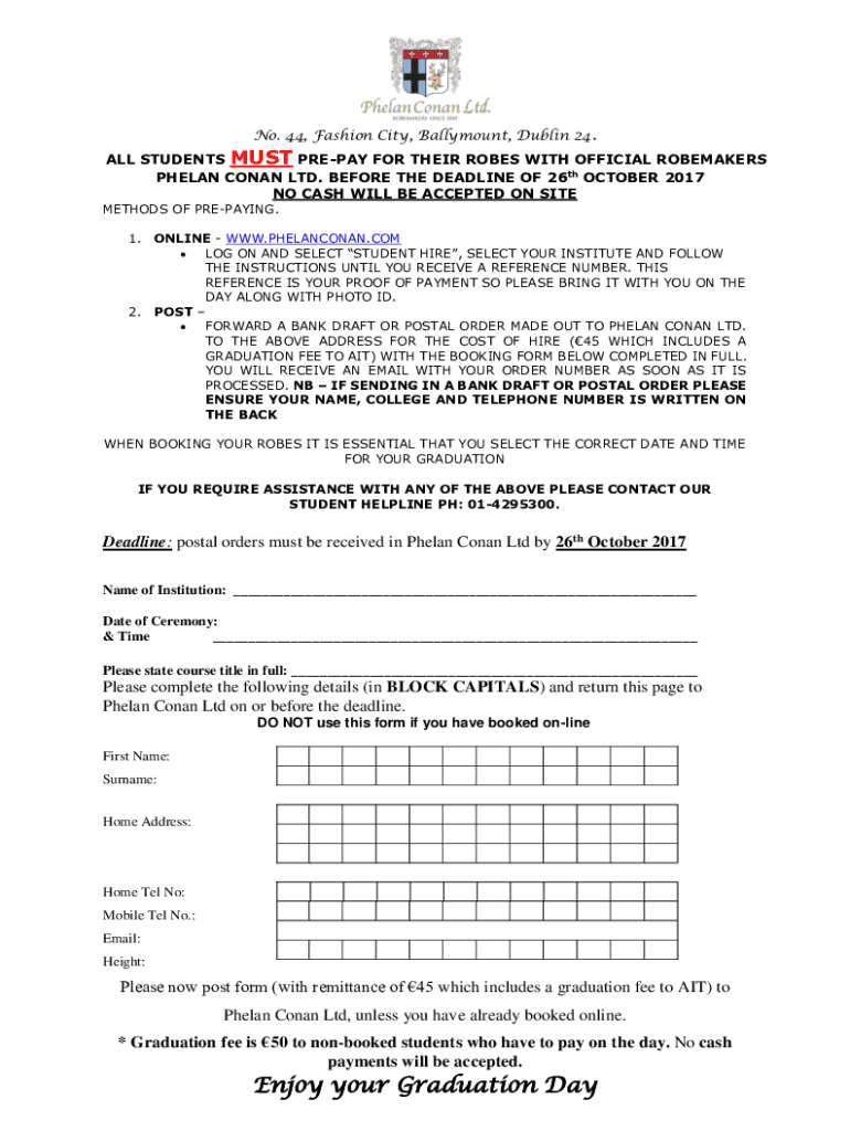 No. 44, Fashion City, Bally mount, Dublin 24 .ALL STUDENTS MUST PREPAY FOR THEIR ROBES WITH OFFICIAL HOMEMAKERS PLAN CONAN LTD. BEFORE THE DEADLINE OF 26th OCTOBER 2017 NO CASH WILL BE ACCEPTED ON