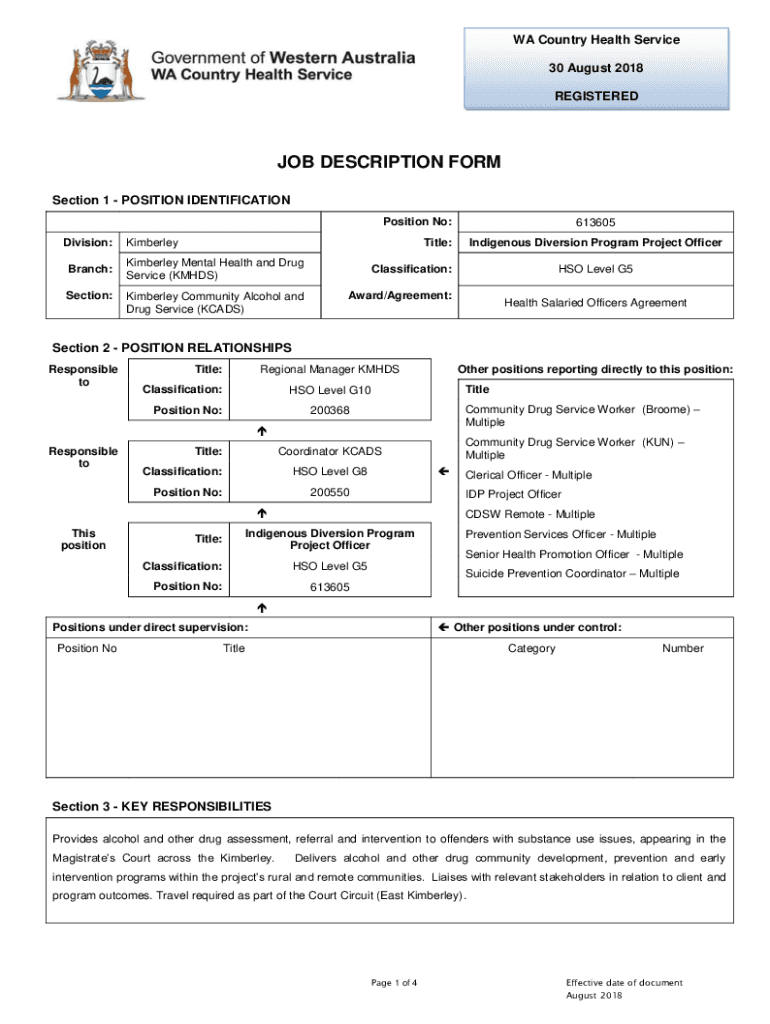 WA Country Health Service 30 August 2018 REGISTERED DESCRIPTION FORM Section 1 POSITION IDENTIFICATION Position No: Division: Branch: Section:613605Title:Kimberley Mental Health and Drug Service (KM