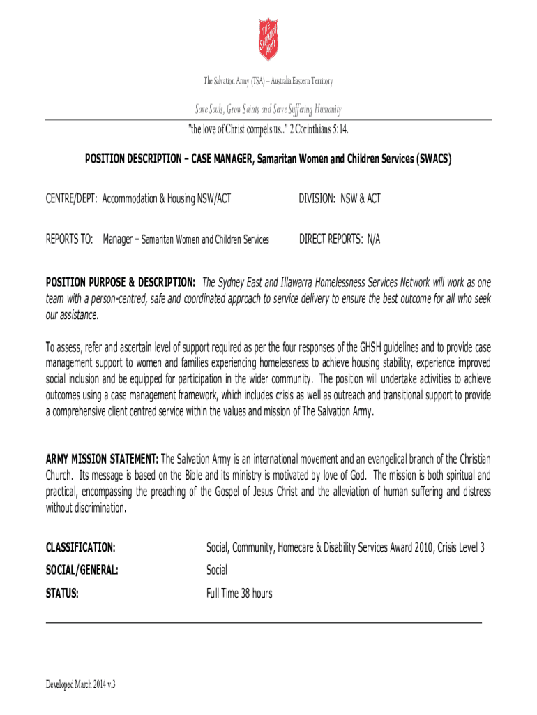 The Salvation Army (TSA) Australia Eastern TerritorySave Souls, Grow Saints and Serve Suffering Humanity \”the love of Christ compels us.\” 2 Corinthians 5:14. POSITION DESCRIPTION CASE MANAGER,