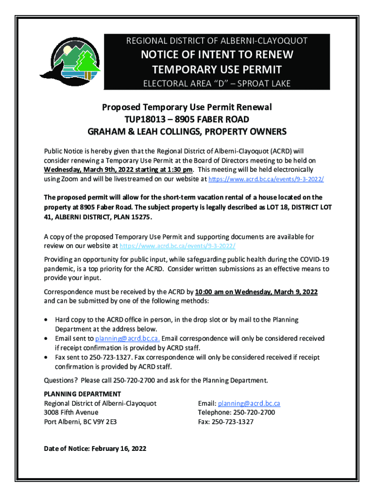 REGIONAL DISTRICT OF ALBERNICLAYOQUOTNOTICE OF INTENT TO RENEW TEMPORARY USE PERMIT ELECTORAL AREA D SPROUT LAKEProposed Temporary Use Permit Renewal TUP18013 8905 FABER ROAD GRAHAM & LEAH COLLINS,