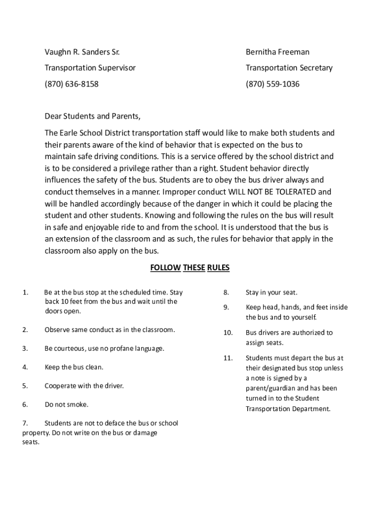 Vaughn R. Sanders Sr. Bernitha FreemanTransportation SupervisorTransportation Secretary(870) 6368158(870) 5591036Dear Students and Parents, The Earle School District transportation staff would like