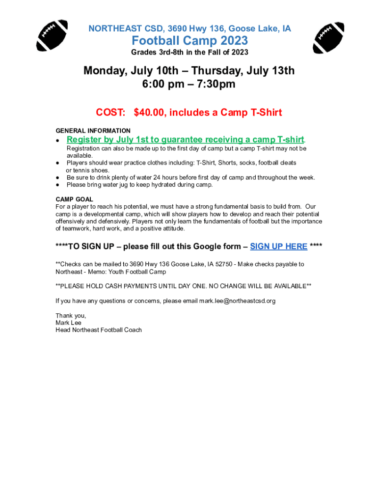 NORTHEAST CSD, 3690 Hwy 136, Goose Lake, Football Camp 2023 Grades 3rd8th in the Fall of 2023Monday, July 10th Thursday, July 13th 6:00 pm 7:30pm COST: $40.00, includes a Camp Shirt GENERAL INFORMATION