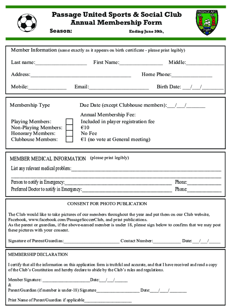 Passage United Sports & Social Club Annual Membership Form Season:Ending June 30th,Member Information (name exactly as it appears on birth certificate please print legibly) Last name:___First Name:___Address:___