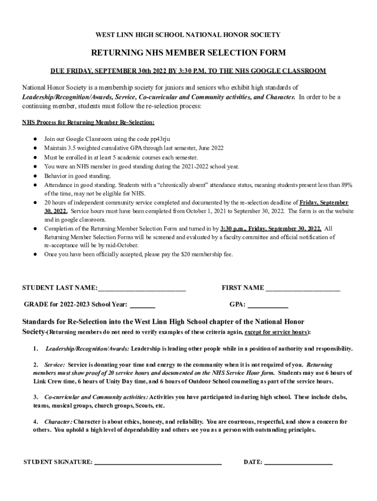WEST LINN HIGH SCHOOL NATIONAL HONOR SOCIETYRETURNING NHS MEMBER SELECTION FORM DUE FRIDAY, SEPTEMBER 30th 2022 BY 3:30 P.M. TO THE NHS GOOGLE CLASSROOM National Honor Society is a membership society