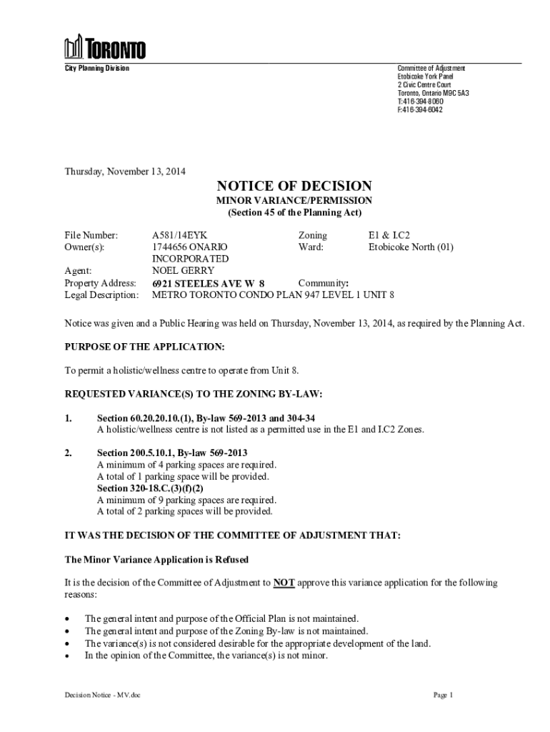 City Planning DivisionCommittee of Adjustment Etobicoke York Panel 2 Civic Center Court Toronto, Ontario M9C 5A3 T:4163948060 F:4163946042Thursday, November 13, 2014NOTICE OF DECISION MINOR VARIANCE/PERMISSION