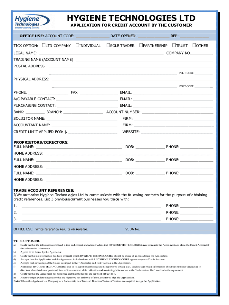 HYGIENE TECHNOLOGIES LTD APPLICATION FOR CREDIT ACCOUNT BY THE CUSTOMER OFFICE USE: ACCOUNT CODE: ___ DATE OPENED: ___ REP: ___ TICK OPTION:LTD COMPANY INDIVIDUALS TRADER PARTNERSHIP TRUST ETHEREAL