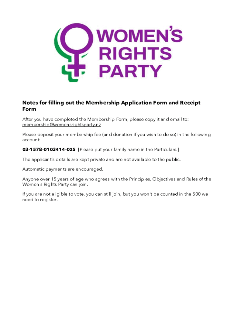 Notes for filling out the Membership Application Form and Receipt Form After you have completed the Membership Form, please copy it and email to: membership@womensrightsparty.nz Please deposit your