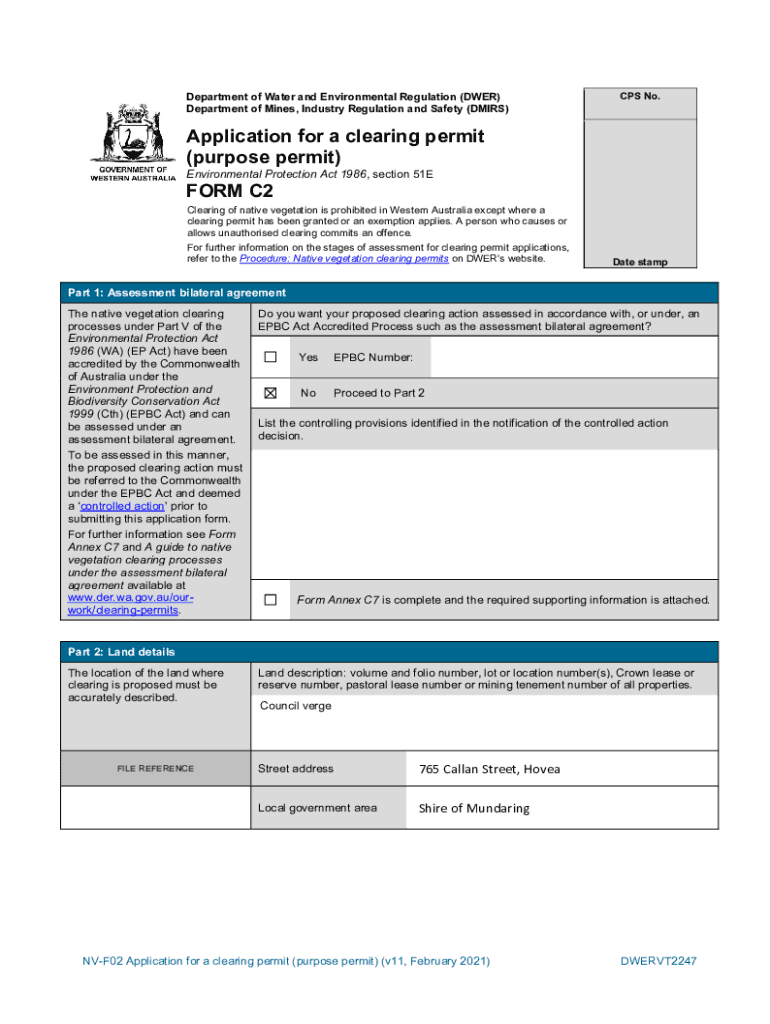Department of Water and Environmental Regulation (DEER) Department of Mines, Industry Regulation and Safety (EMIRS)CPS No. Application for a clearing permit (purpose permit) Environmental Protection