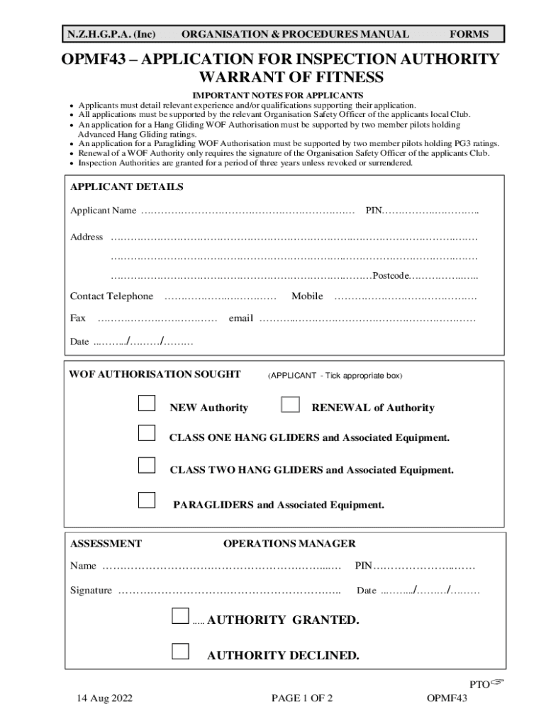 N.Z.H.G.P.A. (Inc)Organization & PROCEDURES MANUALFORMSOPMF43 APPLICATION FOR INSPECTION AUTHORITY WARRANT OF FITNESS IMPORTANT NOTES FOR APPLICANTS must detail relevant experience and/or qualifications