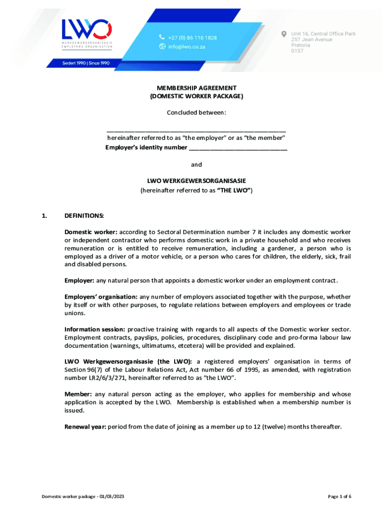 MEMBERSHIP AGREEMENT (DOMESTIC WORKER PACKAGE) Concluded between: ___ hereinafter referred to as the employer or as the member Employers identity number ___ and TWO WERKGEWERSORGANISASIE (hereinafter