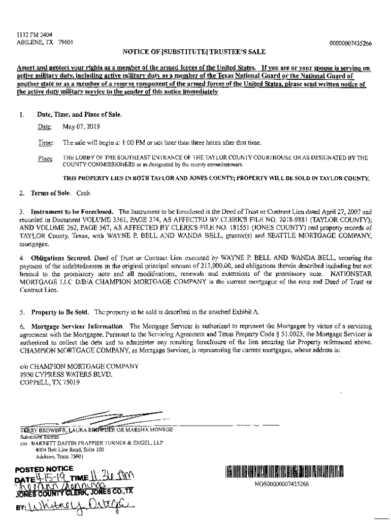 1132 FM 2404 ABILENE, TX 7960100000007435266NOTICE OF [SUBSTITUTE) TRUSTEE\'S SALE Assert and protect your rights as a member of the armed forces of the United States. If you are or your spouse is