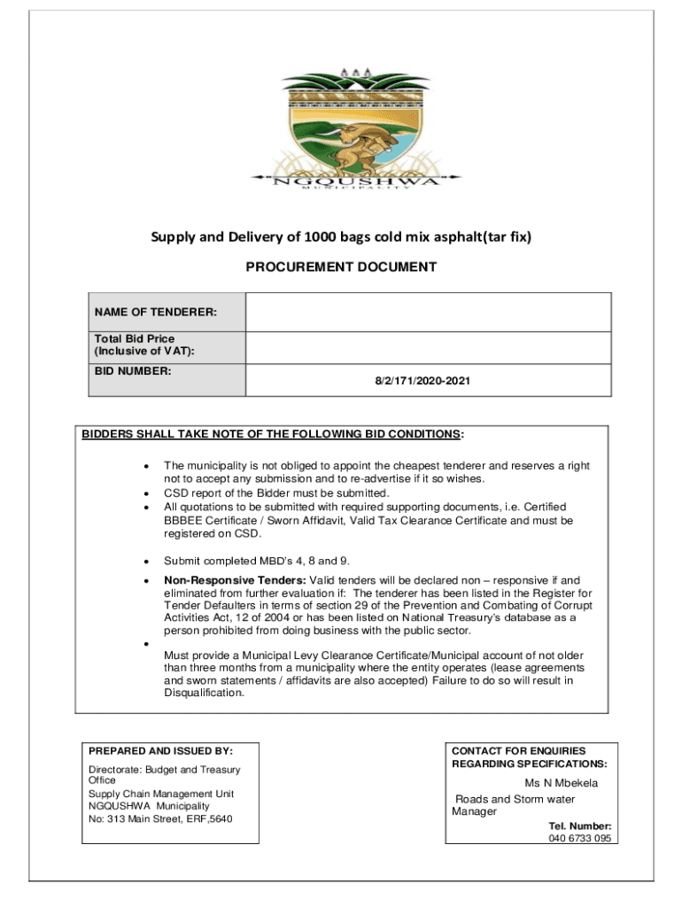 Get the free Supply and Delivery of 1000 bags cold mix asphalt(tar fix) - ngqushwamun gov
