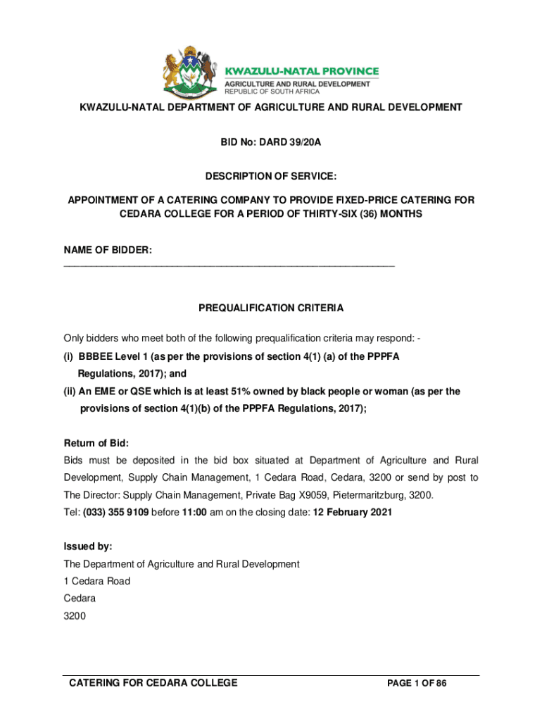 KWAZULUNATAL DEPARTMENT OF AGRICULTURE AND RURAL DEVELOPMENT BID No: HARD 39/20ADESCRIPTION OF SERVICE: