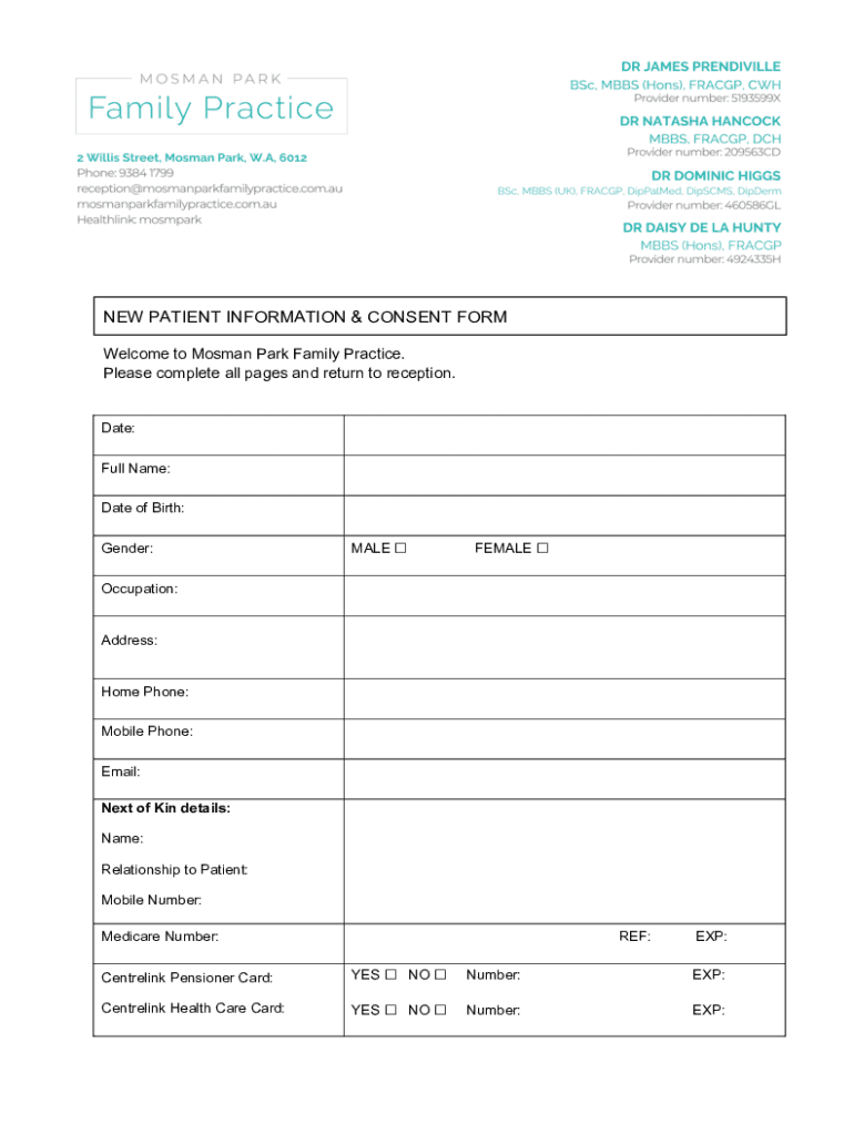 NEW PATIENT INFORMATION & CONSENT FORM Welcome to Osman Park Family Practice. Please complete all pages and return to reception. Date: Full Name: Date of Birth: Gender:MALE FEMALE Occupation:Address:Home